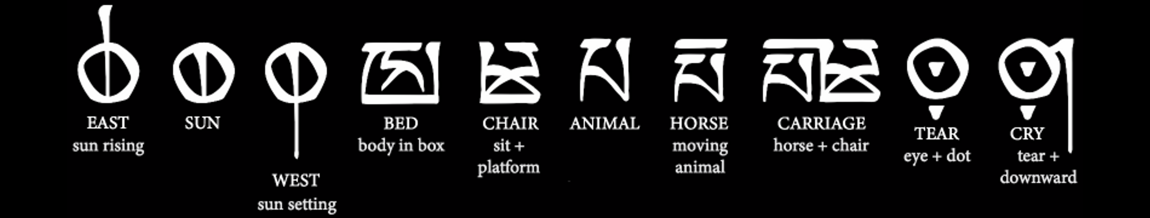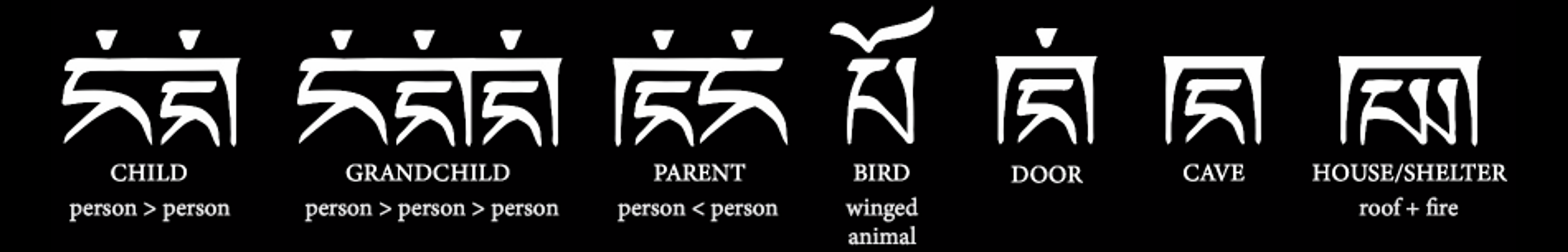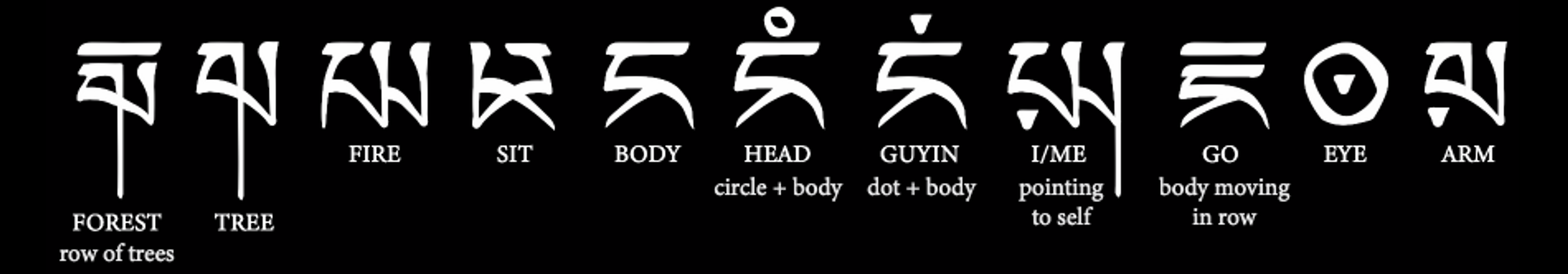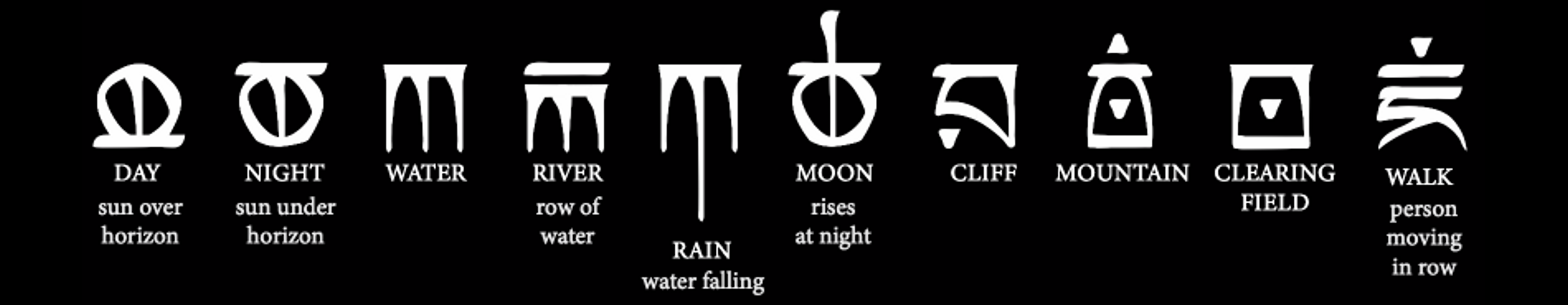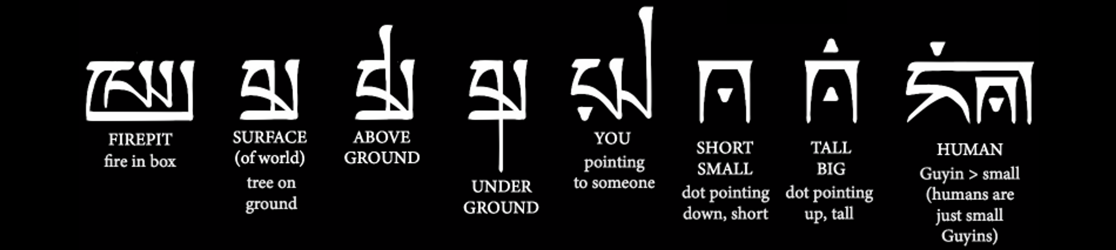 Documented below are all the glyphs in the Guyin writing system. Complex glyphs will often have etymological notes below them.
