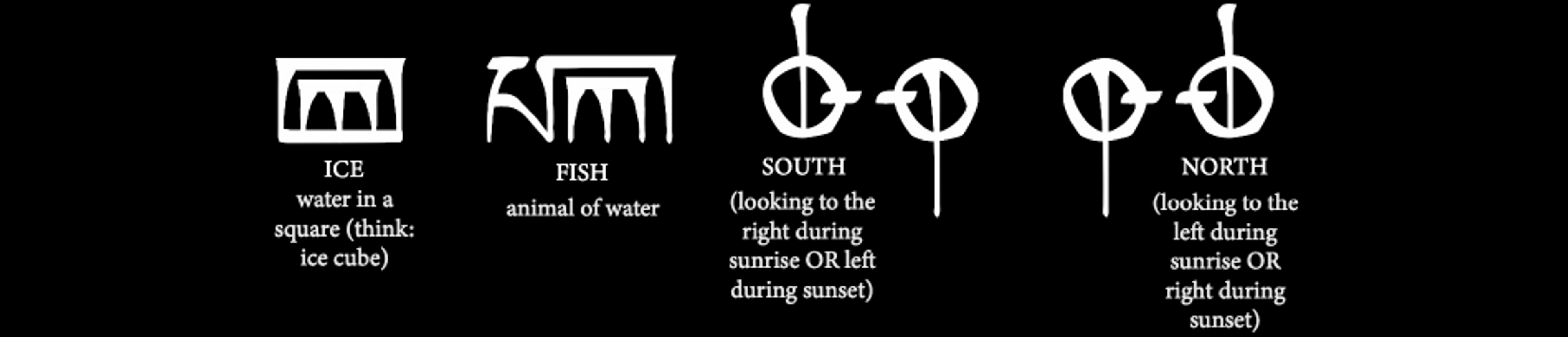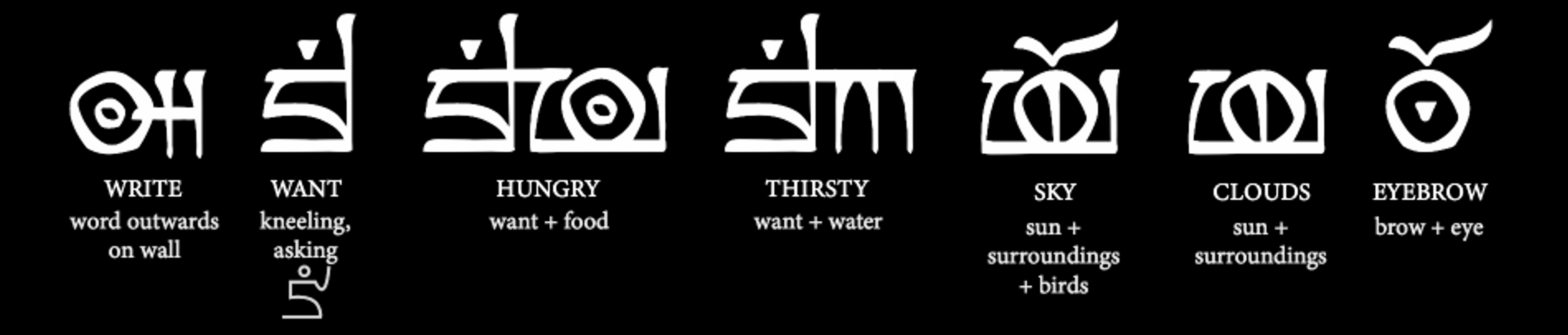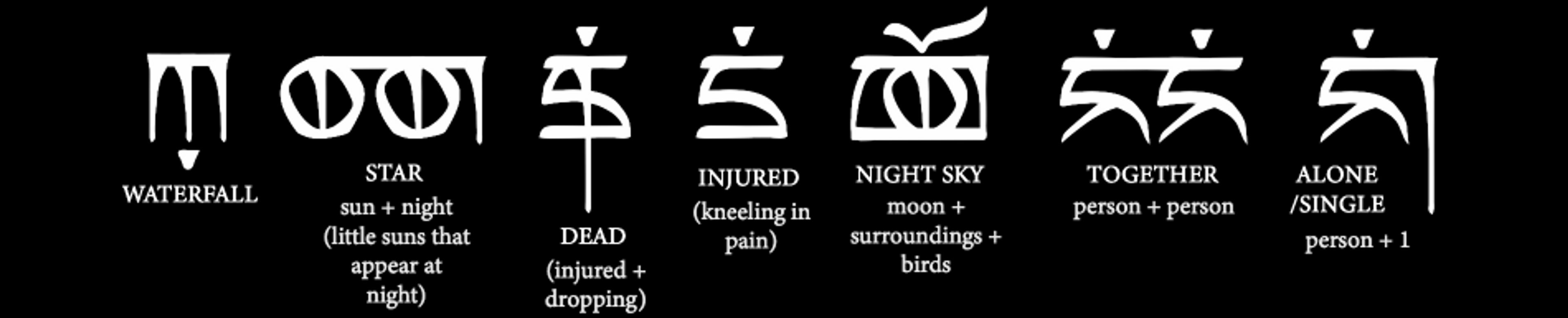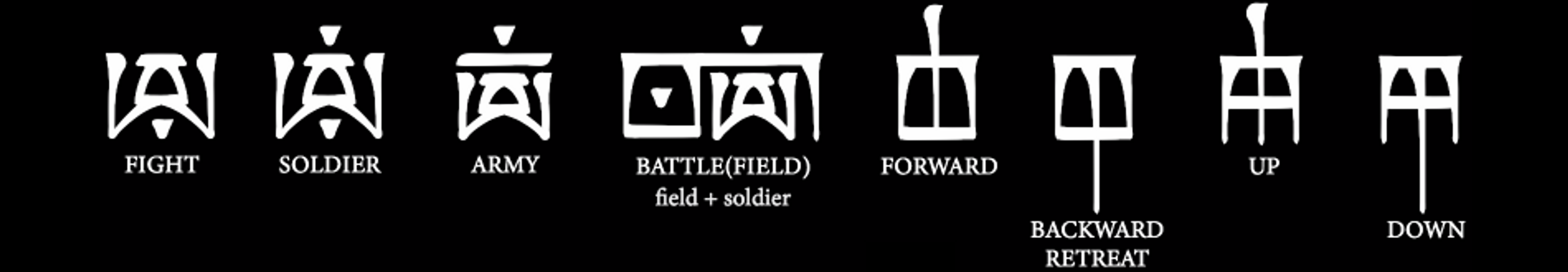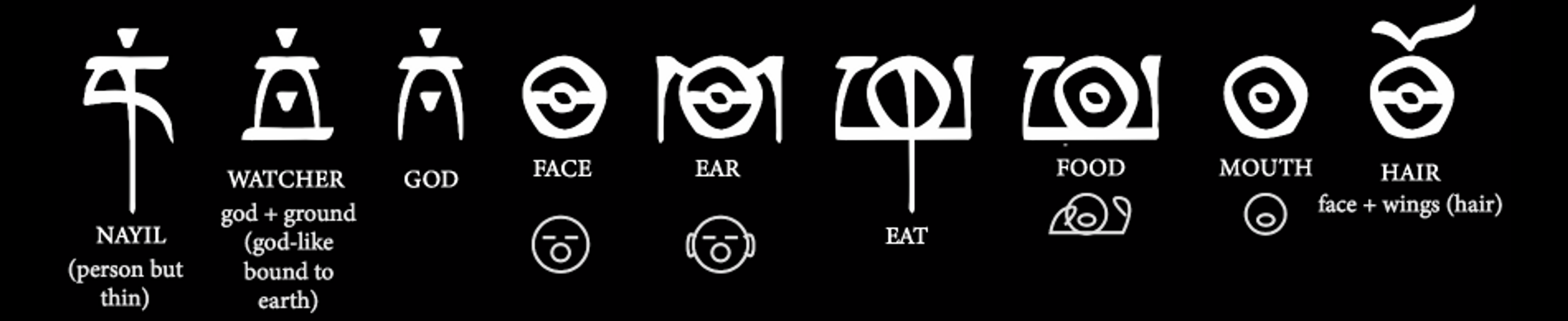 Documented below are all the glyphs in the Guyin writing system. Complex glyphs will often have etymological notes below them.